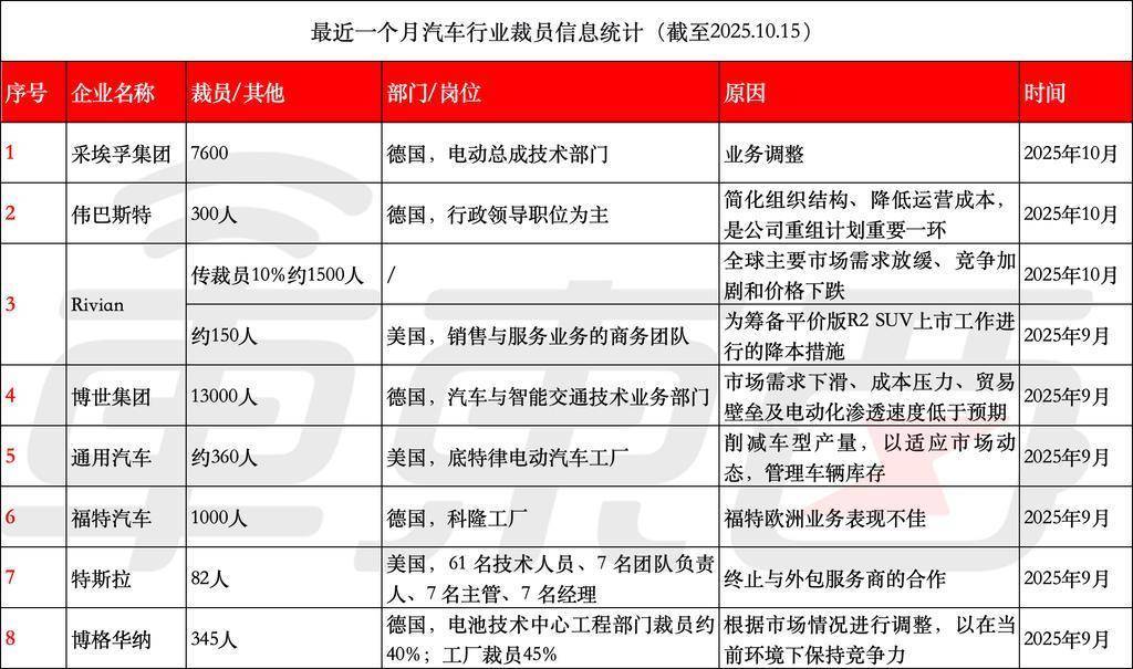 今年三季度,全球汽车行业正经历着一场刺骨的寒流,从德国零部件巨头到美国顶尖汽车集团,再到新能源车企新贵,一波接一波的裁员浪潮正在席卷汽车行业。